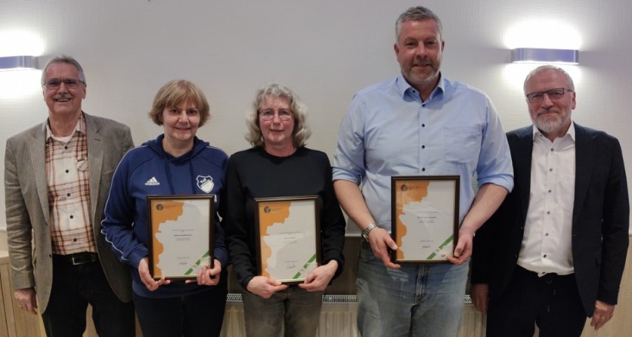 Gold und Silber: (von links) Franz-Josef Schlömer zeichnete Sylvia Engelmann und Petra Böske mit der Goldenen und Frank Schlarmann mit der Silbernen Ehrennadel des Kreissportbundes Vechta aus. Präsidiumsmitglied Ali Boydak gratulierte.