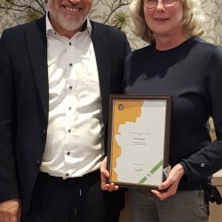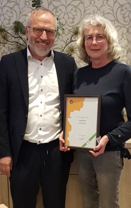 Aus Oythe, wo sie mit ihren Schwestern im Volleyball groß geworden ist, zog es Petra Böske letztendlich ins Osnabrücker Land, doch sie pendelt regelmäßig über die Kreisgrenze zum TuS Neuenkirchen. 2004 stieg sie als Trainerin der 1. Volleyballdamen ein und blieb der TuS-Familie über zwei Jahrzehnte mit größtem Engagement erhalten. 2008 übernahm sie dann die Leitung der Volleyballabteilung. Von den Minis bis zu den Damen: Petra trainierte die unterschiedlichsten Mannschaften und versuchte immer, alle mitzunehmen. Egal, wie gut oder schwierig die Jahre waren: Mit mitreißender Begeisterung und nie versiegendem Optimsmus pushte sie den Volleyball beim TuS. Immer bestens gelaunt. In guten Zeiten wie 2017, als sie zur Sportlerin des Jahres gekürt wurde, soll in der OV sogar gestanden haben: „Petra tanzt vor Freude auf der Bühne.“ Und in weniger guten Zeiten soll sie vor lauter Verzweiflung auch schon mal vor einem Spiel mit den Spielerinnen einen Roten zur Stimmungsaufhellung getrunken haben. Wer mit solcher Leidenschaft über Jahrzehnte die Volleyballabteilung zusammenhält, der verdient sich die Goldene Ehrennadel des Kreissportbundes.