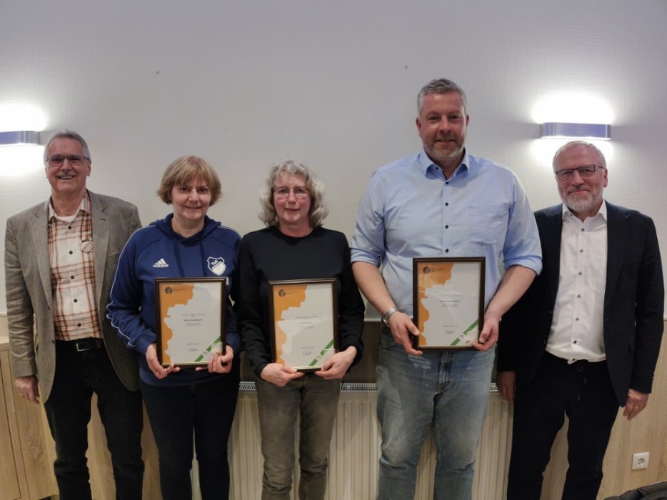 Gold und Silber: (von links) Franz-Josef Schlömer zeichnete Sylvia Engelmann und Petra Böske mit der Goldenen und Frank Schlarmann mit der Silbernen Ehrennadel des Kreissportbundes Vechta aus. Präsidiumsmitglied Ali Boydak gratulierte.