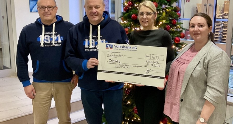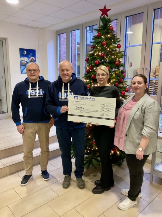 Am 19.12.2025 überreichten die Personalrätinnen Frau Schmidt und Frau Feller im Namen aller Mitarbeiter der Don-Bosco-Schule einen Scheck über 400,- Euro an Andreas Menke (1. Vorsitzender TuS Neuenkirchen, Foto links) und Andreas Berens (Geschäftsführer TuS Neuenkirchen, Foto rechts) für die DKMS.