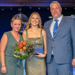 Die blau-weiße Trophäe wurde an Kerstin Dirla überreicht. Frank Schlarmann bezeichnete sie in seiner Rede als eine echte Vereinsseele, engagiert, herzlich, zuverlässig, aber immer mit einem Augenzwinkern. Kerstin war früher im Vorstand des Fahr- und Reitvereins Neuenkirchen aktiv und hat von dort die Liebe zu Pferden in den TuS mitgebracht. Ihre Ponyliga-Abteilung und das Hobby Horsing habe den Verein mit einer neuen Facette bereichert.