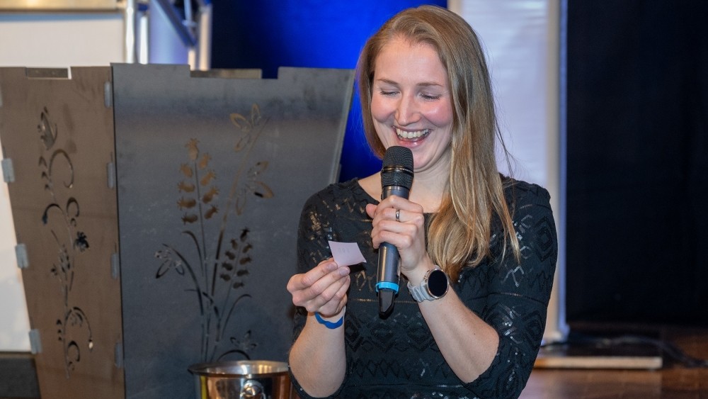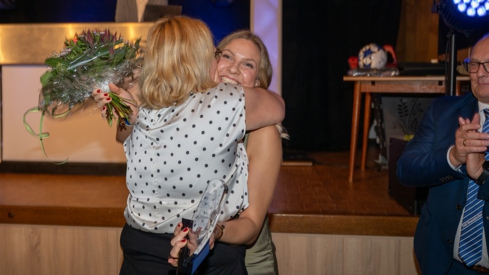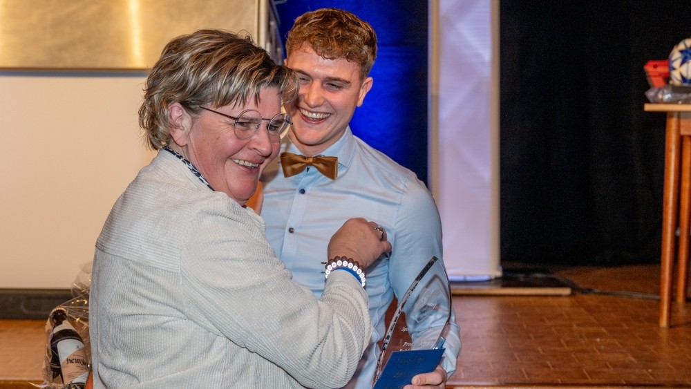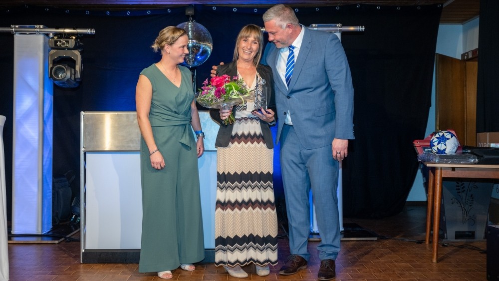 Die blau-weiße Trophäe wurde an Kerstin Dirla überreicht. Frank Schlarmann bezeichnete sie in seiner Rede als eine echte Vereinsseele, engagiert, herzlich, zuverlässig, aber immer mit einem Augenzwinkern. Kerstin war früher im Vorstand des Fahr- und Reitvereins Neuenkirchen aktiv und hat von dort die Liebe zu Pferden in den TuS mitgebracht. Ihre Ponyliga-Abteilung und das Hobby Horsing habe den Verein mit einer neuen Facette bereichert.