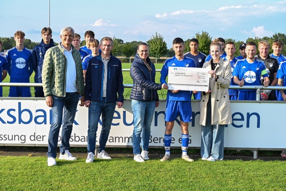 Scheckübergabe von links: Reinhard Rehling (Vorstand Volksbank Dammer Berge eG), Holger Walter (Niederlassungsleiter Volksbank Neuenkirchen), Marion Brand (Marketing Volksbank Dammer Berge eG), Yahya Yildiz (Torschütze 1. Herren TuS Neuenkirchen), Emma Langmann (Marketing Volksbank Dammer Berge eG)
