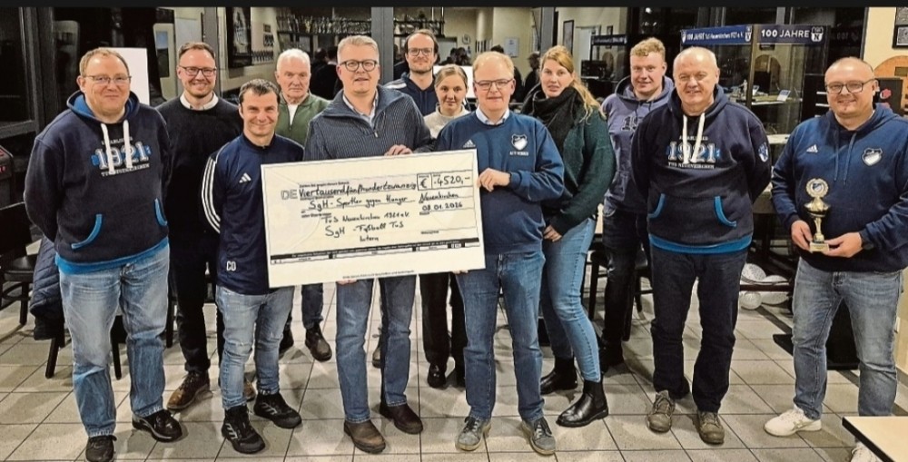 Starke Truppe, großer Scheck: Neuenkirchens Orga-Team am Donnerstag beim Abschlusstermin für die „Champions League für SgH“.