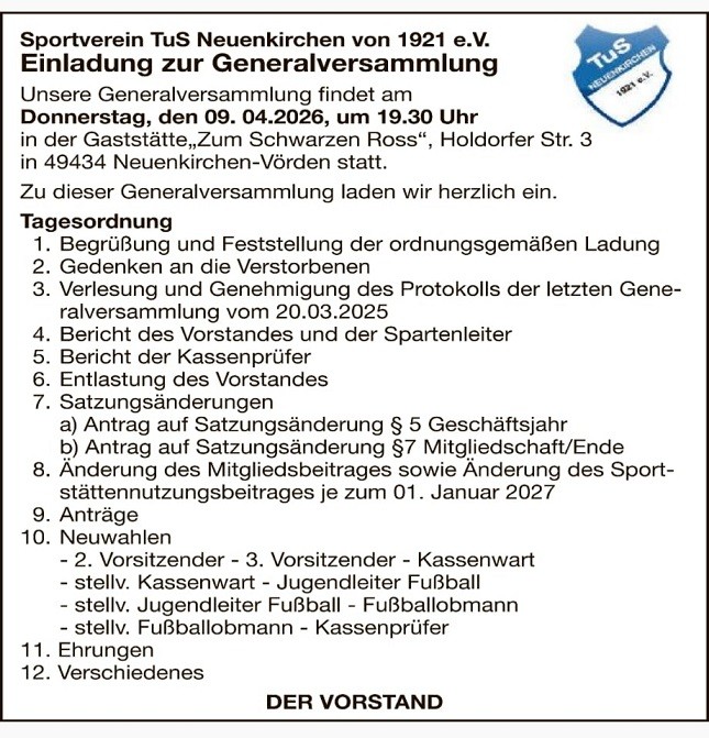 Unsere Generalversammlung findet am Donnerstag, den 09.04.2026, um 19.30 Uhr in der Gaststätte „Zum Schwarzen Ross“, Holdorfer Str. 3 in 49434 Neuenkirchen-Vörden statt.